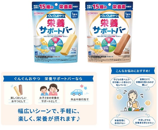 新発売となる「ぐんぐんおやつ 栄養サポートバー」は、鉄・カルシウム・亜鉛・ビタミン・ミネラルなど、成長に必要な15種※1の栄養素を配合し、1本で1日に不足しがちな栄養素※2をカバー。共働きで時間を切り詰めて子育てをする人も多い現代社会において、用意した食事だけではまかないきれない子どもの栄養補給をサポートします。