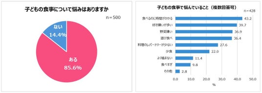 多くの親が大変だと感じる子どもの食事について、悩みが「ある(85.6%)」と答えた人は8割以上を占め、具体的には「食べるのに時間がかかる(43.2%)」、「好き嫌いが多い(39.7%)」、「野菜嫌い(36.9%)」、「遊び食べ(36.4%)」に悩む親が多いことが分かりました。