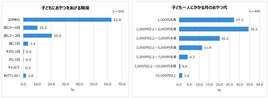 子ども一人にかかる月のおやつ代は、「1,000円以上~2,000円未満(34.5%)」が最も多く、「1,000円未満(27.3%)」と合わせて約6割が2,000円未満と回答しました。