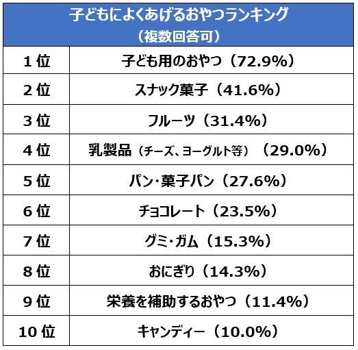 子どもによくあげるおやつ1位「子ども用のおやつ」2位「スナック菓子」3位「フルーツ」