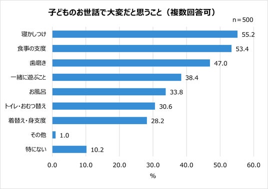 まず、子どものお世話について調査。その結果、約9割が大変だと感じており、中でも「寝かしつけ(55.2%)」「食事の支度(53.4%)」が大変だと回答した人がそれぞれ半数以上いました。