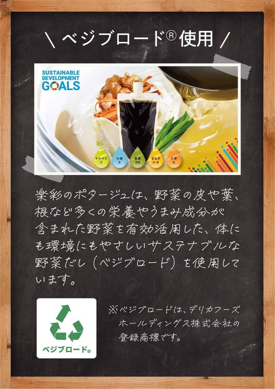 ベジブロード(R)使用楽彩のポタージュは、野菜の皮や葉、根など多くの栄養やうまみ成分が含まれた野菜を有効活用した、カラダにも環境にもやさいしいサステナブルな野菜だし(ベジブロード)を使用しています。