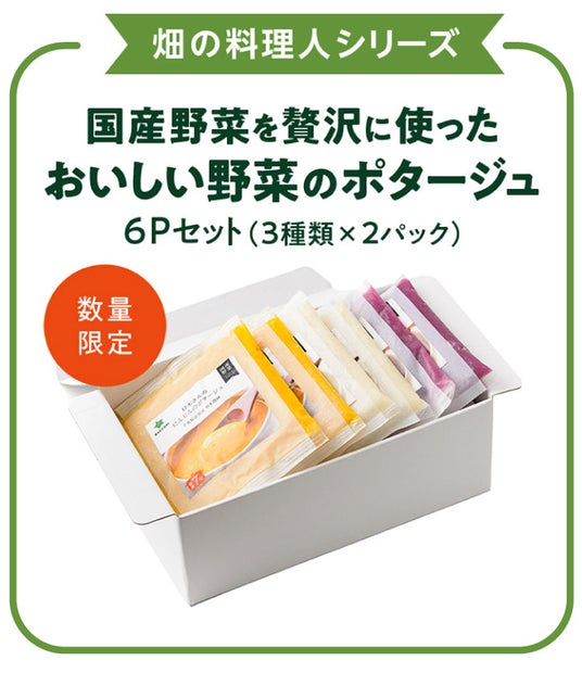 楽彩株式会社(本社:東京都足立区/代表取締役社長:大崎善保)は、8月31日(土)「野菜の日」にあわせて“おいしい野菜のポタージュ6Pセット(3種類×2パック)”を8月30日(金)より販売いたします。楽彩が厳選した新鮮でおいしい野菜を、こだわり抜いた製法でじっくり煮込んだ、贅沢なポタージュスープです。心まであたたまる優しい味わいは、大切な方への贈り物にもピッタリです。