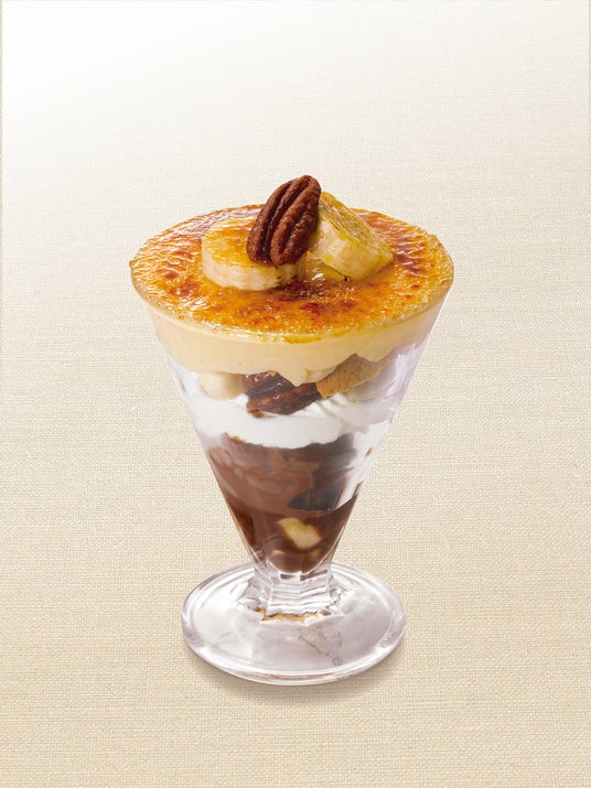 多くのお客様から復活を望まれるお声をいただいた「キャラメルナッツブリュレ」が再登場。チョコレートアイスクリームに塩キャラメルアイス、サクサクと香ばしい食感のキャンディングピーカンナッツを重ねました。表面はバナナを一緒にカリっとキャラメリゼしたデザートで、チョコレートのコクとキャラメルの甘みが美味しいパフェです。