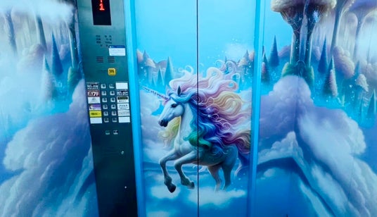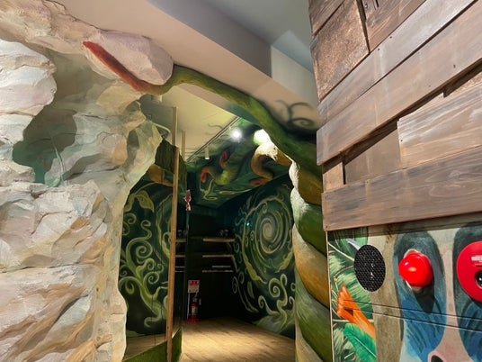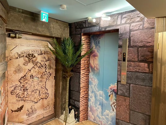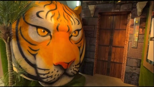 まるでジャングルに迷い込んだかのようなビルの入り口から始まります。巨大なツルがそびえ立ち、ファンタジーのような雰囲気が広がります。また、大きな虎の顔が待ち構え、非日常感を一層高めます。エレベーターの扉は異世界への扉を思わせるデザインで、これから始まるワクワクする体験への期待が高まります。