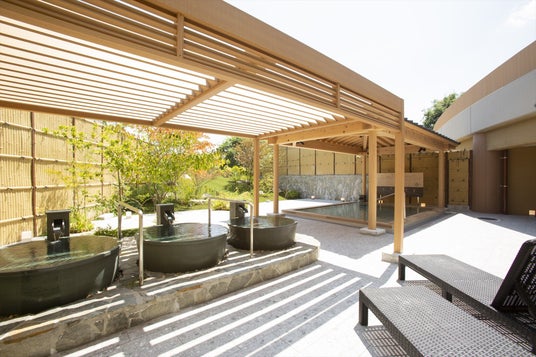 2024年3月に整備された「ホテル夢しずく」の大露天風呂は、新しいコンセプトで設計されています。以前までのゴロゴロとした岩が特徴的な、伝統的な温泉スタイルではなく、「和」と「洋」が巧みに融合したモダンで上質な雰囲気の温泉へと生まれ変わりました。