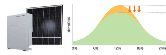 ▲蓄電池で夜間に貯めた電池を日中に使用することで、日中の使用電力量を下げ、効率的に電気を活用できます。また、電気代の節約にもなります。