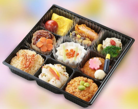 ミニオムレツ・トマト・海老カツ・豆の胡麻和えサラダ・シュウマイ・ブロッコリー・ハンバーグデミグラスソース(花人参のせ)・貝柱グラタンいくらのせ・コロッケ(ボトルソース付き)・モッツアレラチーズ・花麩・茶飯(小海老のせ)・白飯(五色胡麻/パプリカのせ)・チキンライス(枝豆のせ)