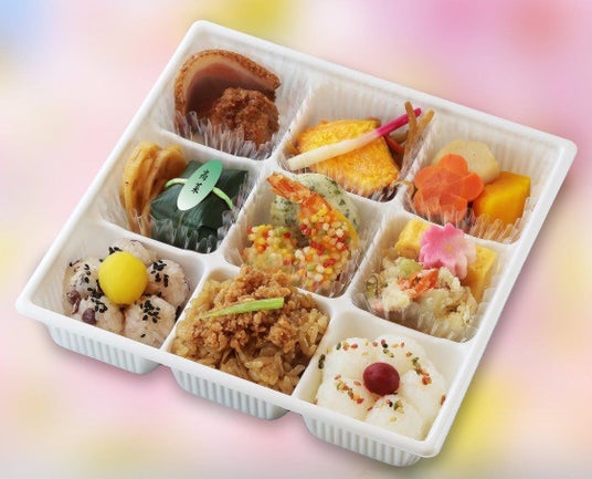 合鴨ロース・鶏つくね・鮭黄身焼き・はじかみ・金平ごぼう・煮物(六角里芋/花人参/かぼちゃ/こんにゃく)・笹一葉 高菜(笹一枚で包んだひと口サイズのお寿司)・蓮根金平・海老の五色あられ揚げ・あおさ真薯・卯の花・玉子焼き・花麩・花型赤飯(栗/黒胡麻のせ)・鶏めし(鶏そぼろのせ)・花型白飯(梅干し/五色胡麻のせ)