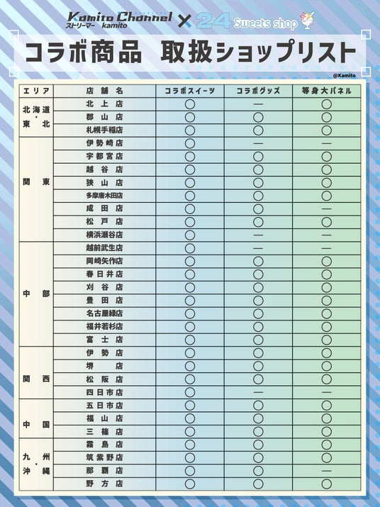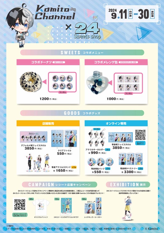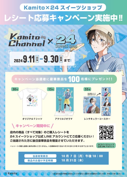 トゥエンティフォー株式会社(本社:広島市佐伯区、代表取締役:久保田翔也)は、人気ストリーマーであるKamito(かみと)とのコラボレーションを記念し、全国の24スイーツショップ店舗およびECサイトにて「Kamito × 24スイーツ」限定キャンペーンを2024年9月11日(水)から9月30日(月)まで開催いたします。