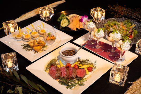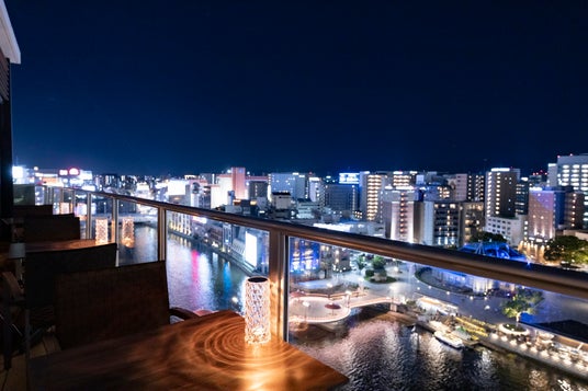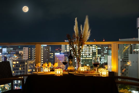 福岡中洲の夜景が一望できるテラス席は、テーブルにススキやキャンドルを飾り、幻想的な空間を演出。異国情緒を感じる料理と秋の風情を愉しみながら、特別なひとときをお過ごしいただけます。
