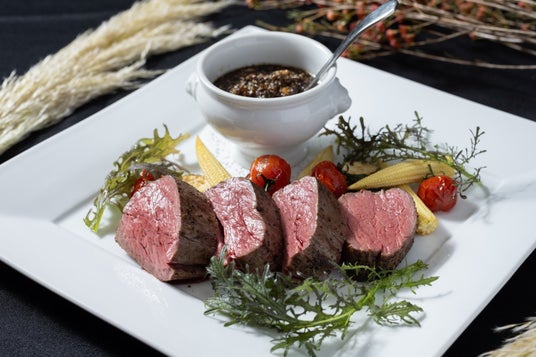 ロゼ色に仕上げた牧草牛のフィレ肉に、黒胡椒のスパイスソースを合わせ、温野菜を添えた一皿