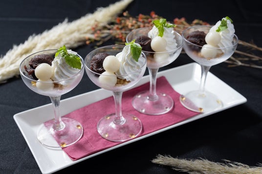 月見をイメージした白玉団子と上質なこし餡を重ねたカップパフェに、フルーツグラノーラのアクセントを添えたデザート