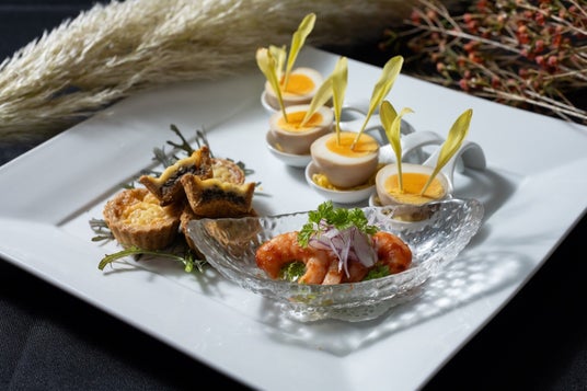 魚醤をベースにしっかりと味を含ませたシンガポール風味玉にコーンスプラウト、錦糸卵をあしらい月の兎と獅子を表現した一品。