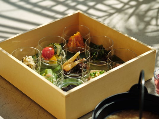 お食事は客室にお届けいたします。夕食3種類と朝食3種類からお選びいただき、各客室の屋外ダイニングテラスでお召し上がりください。プライベートな空間でありながらも、海を眺め、心地よい風を感じながら過ごす開放的な空間でのお食事のひと時をお過ごしください。