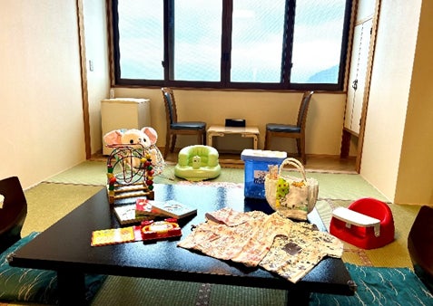 和室10畳の認定部屋には、お子様用ローチェア・ベビー用コップ・フェイスタオル・ベビーソープ・哺乳瓶消毒用具・おむつ専用ゴミ箱・ベビー用防水シート・お子さま用ハンガーなどをセット。