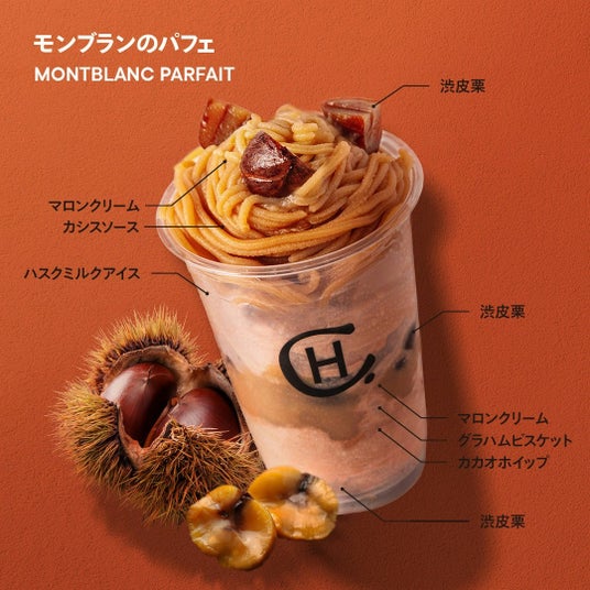 ホテルショコラの芳醇なカカオと秋の味覚である栗を組み合わせた秋限定のパフェです。ザクザク食感のグラハムクッキー、ハスクミルクアイス、カカオホイップ、濃厚なマロンクリームを重ね、パフェの下部と中央、トップに栗の渋皮煮が入り、どこからでも栗の深みを堪能できるように仕上げました。