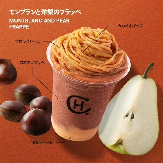 濃厚なマロンクリームの風味とみずみずしい洋梨の甘さが絶妙に調和した特別なフラッペです。洋梨ピューレとカカオフラッペの深い風味が織りなす味わいに、マロンクリームがアクセントとなっています。カカオホイップの滑らかさが全体を引き締め、最後まで飽きずに楽しめる、この季節にぴったりのフラッペです。