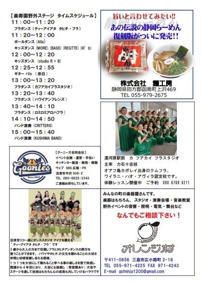 また、地元のキッズダンス、アロハダンス、ブラスバンド、和太鼓、バンドなど、多様なステージイベントがフェスをさらに盛り上げます。 家族連れで楽しめるよう、子供達が遊べるエリアもご用意しております。