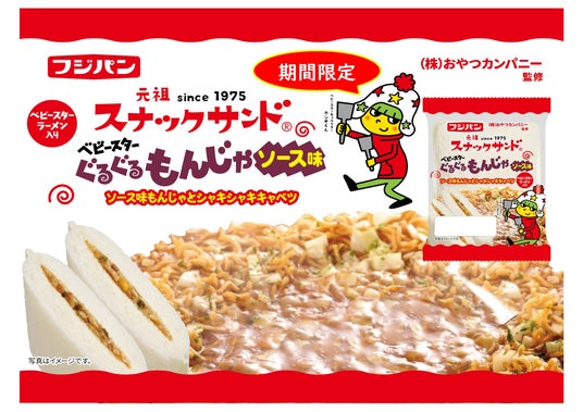 ヘラを持ったベビースターキャラクター「ホシオくん」が登場するパッケージが目印の期間限定コラボ商品は、具材にベビースターラーメンを使用し、濃厚なもんじゃソースとシャキシャキした食感のキャベツを組み合わせることで、「ベビースターぐるぐるもんじゃソース味」の食感とソースの味わい再現し、アクセントにしょうがの味をきかせました。ふんわりとしたパンとベビースター入りで濃厚なソースの香りが広がる、「スナックサンド」×「ベビースター」のコラボをお楽しみください。