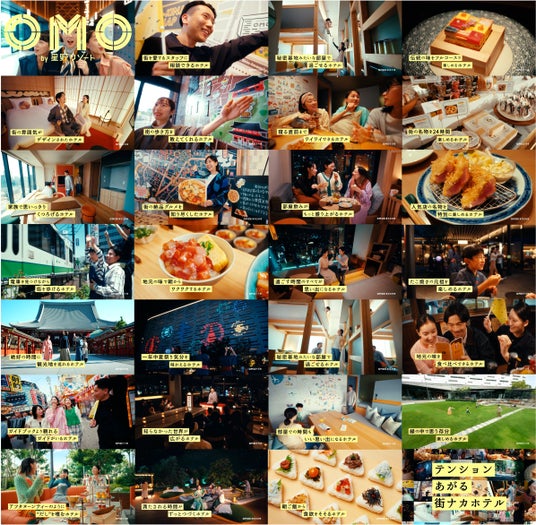 星野リゾートが全国17施設で展開するテンションあがる「街ナカ」ホテル「OMO(おも)」は、2024年9月1日より、「”新感覚”な『街ナカ』ホテル」をテーマにした新たなCMを配信します。OMO7大阪、OMO5東京五反田、OMO5東京大塚、OMO3浅草の4施設を舞台に、女性グループ、カップル/夫婦、家族が、客室・グルメ・アクティビティなどの”26の新感覚な魅力”を体験する様子を描きます。撮影した全26のシーンの中から構成した複数パターンの30秒CMを公開。今後もシーンを変えて、順次展開してゆきます。