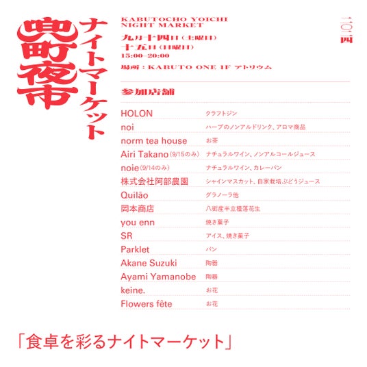 HOLONのクラフトジン、Parkletのビールとおつまみパン、家族で営むワインバーnoieのナチュラルワイン、果物やお茶などを使ったAiri Takanoによるノンアルコールジュース、山梨県富士吉田市を拠点に活動するnoiのハーブティ、norm tea houseによるブレンドのお茶、新潟県の阿部農園によるオリジナルぶどうジュース通称ジュ・ド・レザン、you ennの焼き菓子、Quilaoのおつまみグラノーラ、岡本商店の落花生、SRのアイスクリームなど、夏の余韻を楽しむのにぴったりなドリンクや軽食をご用意してお待ちしております。また、食卓を彩るのに欠かせない季節のお花はkeine.とFlowers fete、そして今回は陶芸家であるAkane SuzukiさんとAyami Yamanobeさんがご自身の陶器作品を持ってきて下さいます。直接手に取って購入頂けるめったにない機会となっております。兜町夜市ナイトマーケットは入場無料、どなたでもお越しいただけます。