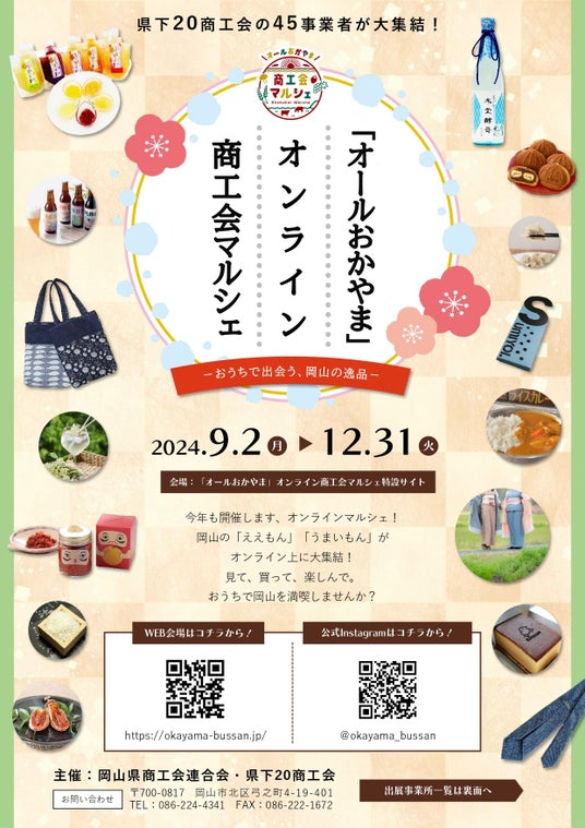 このたび、岡山県商工会連合会と県下20商工会では、新たな販売機会の創出により、事業者の稼ぐ力の強化を図り、地域経済の活性化に寄与することを目的に、「オールおかやま」オンライン商工会マルシェを昨年に引き続き開催いたします。今年は総勢45事業者の様々な商品が集まりました。