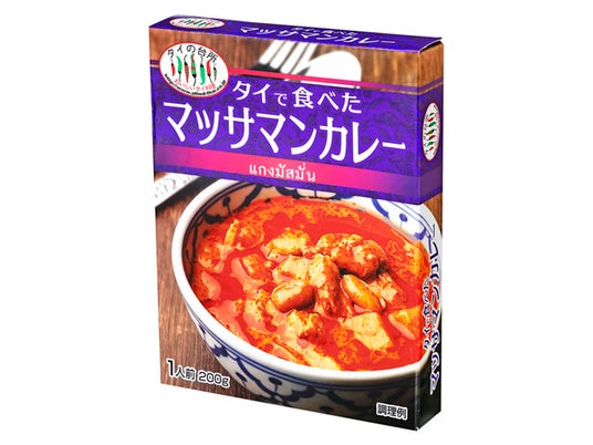 タイで食べた現地の味を目指して開発したレトルトのマッサマンカレーです。唐辛子、シャロット、レモングラス、にんにく、ガランガル、タマリンドなどタイのハーブとスパイスをふんだんに使い本場の味を再現しました。タイのハーブとスパイス、鶏肉、野菜を煮込んだマイルドでコク深い甘さの中に辛味と酸味がアクセントとなり味を引き締めます。