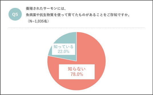 このような回答にも関わらず、7割以上の人が「養殖されたサーモンには、魚病薬や抗生物質を使って育てたものがある」ことを知らないと回答(78.0%)。多くの人が養殖における現状を把握していない状況にあるようです。