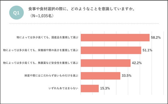 食事や食材選択の際に、どのようなことを意識しているか聞いたところ、58.2%が「多少高くても、国産品を重視して選ぶ」と回答しました。さらに51.1%が「多少高くても、栄養価や質の高さを重視して選ぶ」と回答し、42.2%が「多少高くても、無農薬など安全性を重視して選ぶ」と回答しています。円安や物価高などが家計を直撃している状況にも関わらず、価格より品質を意識して物を選ぶ人々が半数近くいることが明らかになりました。