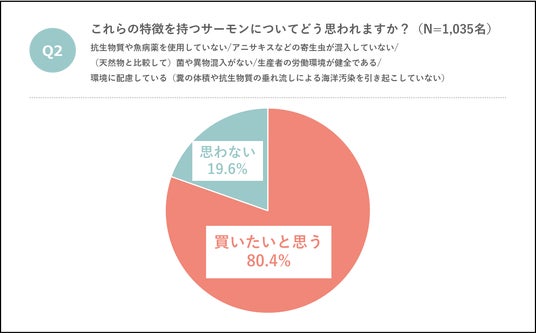 そして、閉鎖循環式陸上養殖サーモンの特徴である、「抗生物質や魚病薬の不使用」、「アニサキスなどの寄生虫が混入していない」、「(天然物と比較して)菌や異物混入がない」、「環境に配慮している(糞の体積や抗生物質の垂れ流しによる海洋汚染を引き起こしていない)」、「生産者の労働環境が健全である」といったクリーンな要素を兼ね備えたサーモンに対する購入意向を聞いたところ、80.4%が「買いたい」と回答しました。