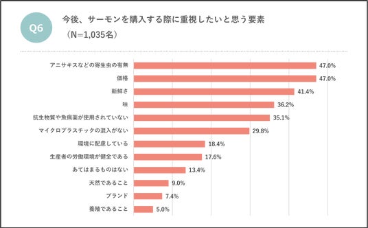 また、今後サーモンを購入する際に重視したいと思っている要素について聞いたところ、「価格」(47.0%)と並んで「アニサキスなどの寄生虫の有無」(47.0%)を重視したいという回答が上位に並びました。続いて重視するのは、「新鮮さ」(41.4%)、「味」(36.2%)、「抗生物質や魚病薬が使用されていない」(35.1%)となっています。価格と並ぶほど、アニサキスへの恐怖を感じているようです。