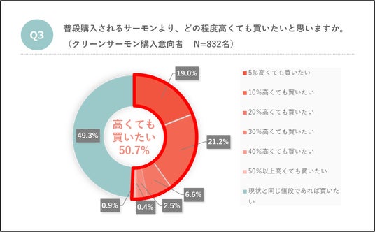 さらに、50.7%にものぼる半数以上の方が、現状より高くてもこれらのサーモンを「買いたい」と回答。子育て中の方々(160名)に至っては、60.6%にものぼりました。「クリーンサーモン」とも言える特徴を持ったサーモンへの支持が明らかになりました。