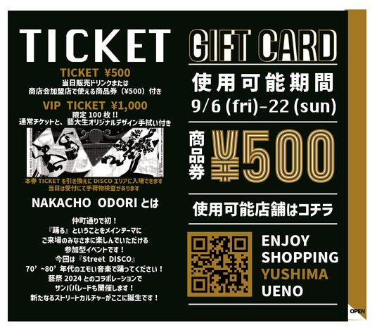 ディスコにご参加される方はチケットをご購入ください。チケットには商店会加盟店で使える500円の商品券が付いてきます。また100枚限定で藝大生オリジナルデザインの手拭い付きのVIPチケットも販売いたします。この機会にぜひレアなグッズも手に入れてください。商品券の使用店舗につきましては下記をご参照ください。
