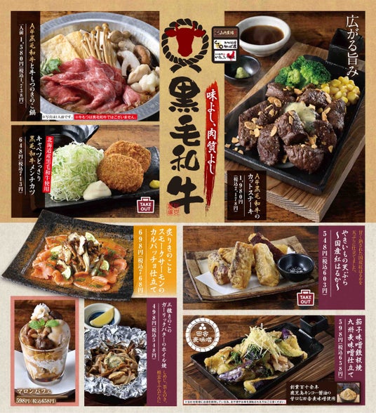 株式会社モンテローザ(本社:東京都杉並区梅里1-21-15 代表取締役:大神輝博)は、「山内農場」「くろ◯」「かば屋」「かみふうせん」で季節限定メニューを販売いたします。A4ランクの黒毛和牛を贅沢に使用した「カットステーキ」「お鍋」や北海道産黒毛和牛を使用した「メンチカツ」に加え、「やきいもの天ぷら」「三種きのこのガーリックバターのホイル焼」「マロンパフェ」など、秋の味覚を存分に味わえるメニューをご用意いたしました。