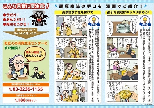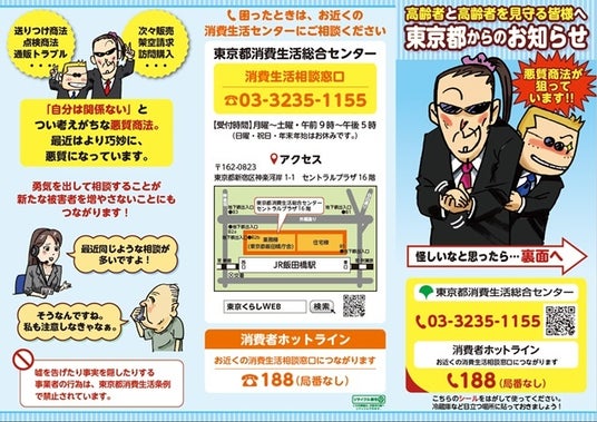配布するリーフレットには、悪質商法の手口を紹介した漫画や消費者ホットラインの電話番号が書かれており、「怪しいな」と感じたときに相談するきっかけにして欲しいと東京都消費生活総合センターは考えています。しかし、高齢者の中には、なかなか相談に踏み出せない方もいるため、利用者との会話の中で配達員が違和感を覚えた場合は、相談を促すことも想定しています。