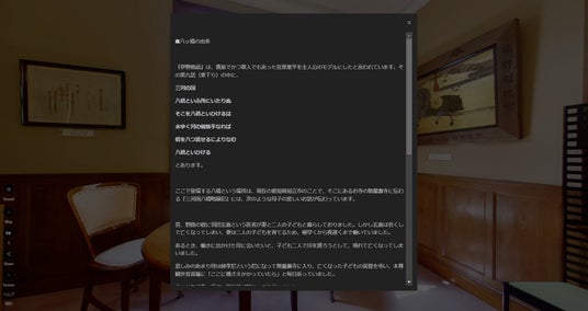 また、バーチャル空間内には「西尾八ッ橋の里」の歴史的なメモや、各お部屋の雰囲気を撮影した動画も配置しております。来店前の下見や、来店後の想い出としていつでも店内にいる雰囲気を味わっていただける工夫を凝らしています。