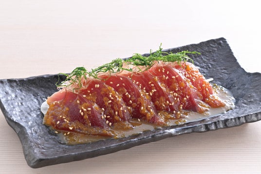ぶえん鰹の黄身ソース醤油がけ鮮度抜群のぶえん鰹の旨みと、もちもちとした食感が絶品といえる一品です。黄身ソースのコクと、醤油の塩味が、鰹の旨みをさらに引き立てます。