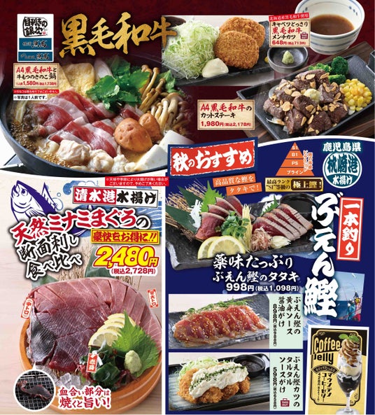 株式会社モンテローザ(本社:東京都杉並区梅里1-21-15 代表取締役:大神輝博)は、「目利きの銀次」「横濱魚萬」「濱焼北海道魚萬」で季節限定メニューを販売いたします。「薬味たっぷりぶえん鰹のタタキ」「ぶえん鰹の黄身ソース醤油がけ」「ぶえん鰹カツのタルタルソースがけ」 といった鮮度抜群の鰹料理や清水港で水揚げされた天然のミナミまぐろを使用した「天然ミナミまぐろの断面刺し食べ比べ」、黒毛和牛A4ランクの鍋やカットステーキなどがお楽しみいただけます。