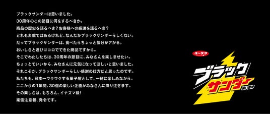 日頃からブラックサンダーをご愛顧いただきありがとうございます。誕生から紆余曲折あったブラックサンダーですが、今年めでたく30周年を迎えることができました。これもひとえに皆さまのご支援の賜物であると感じております。重ねて御礼申し上げます。これからも皆さまのオナカとココロを満たし続けていきます。