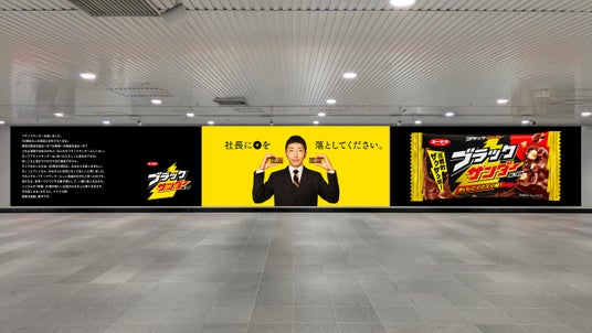 広告には、ブラックサンダーを両手に持つ有楽製菓社長の姿と、「社長に?(雷)を落としてください。」という文字が書かれています。広告に描かれている雷マークがスマートフォンのフラッシュマークを意味しており、フラッシュを焚いて広告を撮影することで、雷に打たれた社長の姿とともに30周年のテーマである「30の楽雷」が浮かび上がるという仕掛けが施されています。この仕掛けに気づいた人たちが特別な体験ができる、体験型の交通広告となっています。