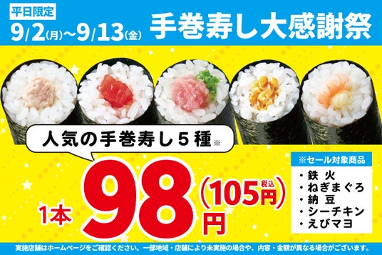 手巻寿し5種類が、なんと!98円!!(税込105円)!特別価格で販売いたします!!