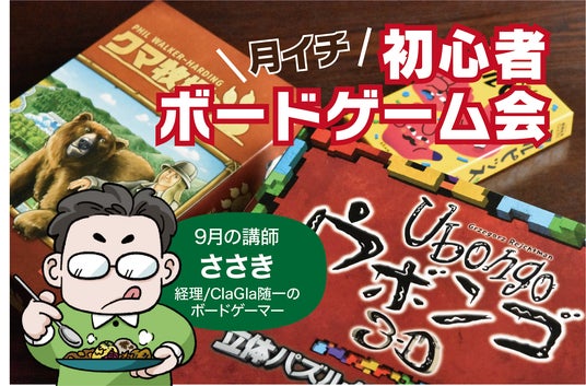 やってみたいボードゲームはあるけど、ルールブックを読んで理解するのにハードルを感じてしまう方でも安心。初心者ボードゲーム会では、ClaGlaのスタッフが講師としてゲームのルールを説明してくれます。9月の講師は経理のささきさん。ささきさんは経理でありながらボードゲームに関する知識はClaGla随一のボードゲーマーです。ぜひゲーム関する面白い情報も聞いてみてください。