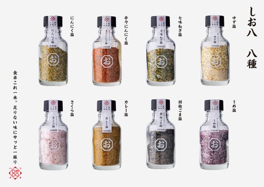 「しお八」は、食卓の日常使いの定番調味塩として年間を通じて料理の味足しや味変えにお使いいただき発売から25年、販売数量は累計100万本(※1)を突破しました。今回のリニューアルでも、引き続き食卓の定番調味塩として品質・味の向上と楽しいラインナップを追求します。また、日常的に手に取りたくなる調味塩であることと、日常に違和感なく溶け込み料理の助っ人としての役割を目指し、シンプルでありながら調味塩らしい品質感と現代感のあるパッケージデザインに変更しました。