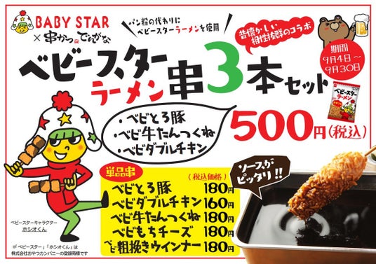 そのまま食べても美味しいベビースターは、実は料理にも使える?万能おやつ”。そんなベビースターを衣としてまとわせたコラボ串メニュー5種が串かつ居酒屋『串かつ でんがな』とネオ居酒屋『串かつとお酒 でんがな』にて9月4日の『串(くし)の日』より復活します!
