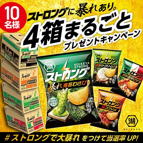“暴れ”シリーズの新商品「湖池屋ストロング 暴れ海苔わさび」の発売を記念し、当商品を含む「湖池屋ストロング」4品が各1箱(計4箱)当たるキャンペーンを実施します。X(旧Twitter)上でのフォロー&リポストだけで、4箱まるごとガツンと当たるキャンペーンに、みなさまぜひご参加ください!