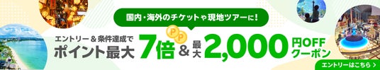 「楽天トラベル観光体験」では、初めてサービスを利用し(注)、韓国・台湾・ハワイ・グアムのアクティビティやチケットを0と5のつく日に予約したユーザーを対象に、通常予約時の7倍となる「楽天ポイント」を進呈するキャンペーンを実施します。さらに、すべてのユーザーを対象に、国内のアクティビティやチケットの予約に利用できる最大2,000円オフのクーポンも配布します。