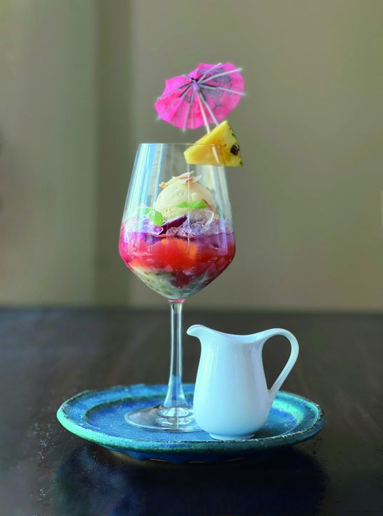 きび砂糖を使ったぜんざいは素朴で優しい甘さに仕上がり、ベトナム現地のゆるやかな時間を思わせ心がほぐれます。カサブランカシルクでは、これにベトナム産スイカジュースで作ったゼリー、キウイ、マンゴーなどのフルーツ、自家製バニラアイス、クラッシュアイスを合わせて華やかに仕上げました。ココナッツミルクソースは好みの甘さで調整できるように、別添えにしてあります。