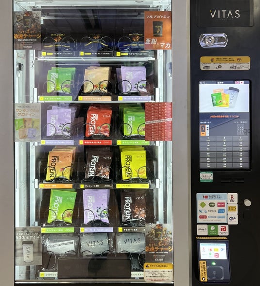 今回、大手町駅に初登場したVITASプロテインの自販機。9月2日~9月30日の期間、地下2階の B0出入り口付近に1台設置されます。自販機で購入できるのは次の3商品。