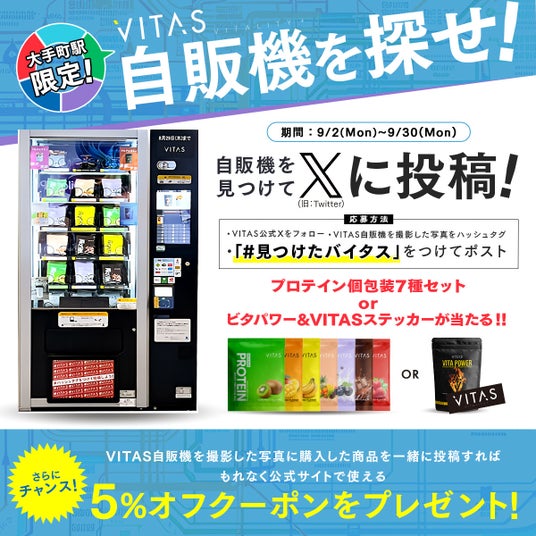 そこでなんと、今回もプレゼントキャンペーンを実施!期間内に自販機を見つけて写真を撮り、 X(旧Twitter)に写真とともにハッシュタグ「#見つけたバイタス」を投稿すると、「プロテイン個包装7種セット」もしくは「VITA POWER & VITASステッカー」が当たるチャンス!ぜひ挑戦してみてくださいね。